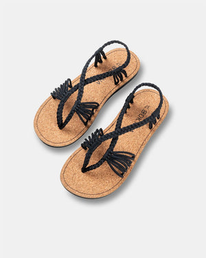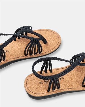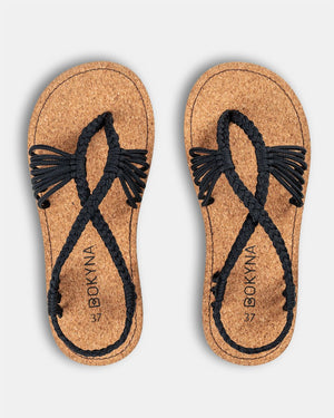 ¡Atrae todas las miradas con Bokynas en negro y corcho! Diseñado con una suela de corcho y correas de nailon negro, este par de sandalias hechas a mano combina con todo, sin importar el color. ¡Estarás radiante!